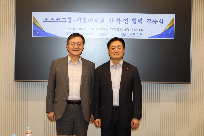 | 유홍림(왼쪽) 서울대 총장이 포항 벤처밸리를 둘러보고 산학연 협력방안을 논의한 뒤 포스코홀딩스 김지용 미래기술연구원장과 기념촬영을 하고 있다.<포스코홀딩스 제공> |