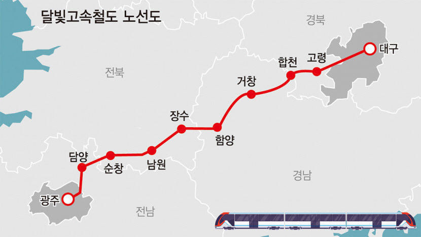 달빛고속철도는 서대구역과 광주 송정역을 잇는 총연장 198.8㎞의 동서 간 고속철도다. 대구의 옛 이름인 '달구벌'과 광주의 순우리말인 '빛고을'의 앞글자를 따서 이름 지었다.