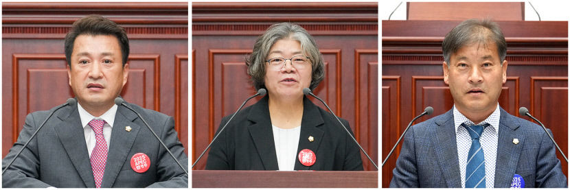 | 4일 경북 경주시의회 본회의장에서 '제277회 경주시의회 임시회'가 열린 가운데 최재필(왼쪽부터)·이강희·주동열 의원이 5분 발언을 하고 있다. <경주시의회 제공> |