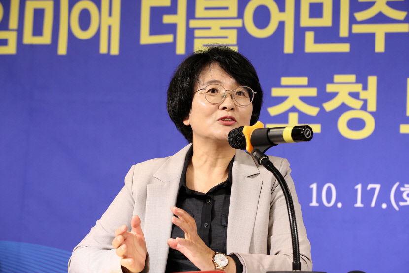 | 더불어민주당 임미애 경북도당 위원장이 17일 열린 아시아포럼21 초청토론회에서 기자들의 질문에 답하고 있다. <아시아포럼21 제공> |