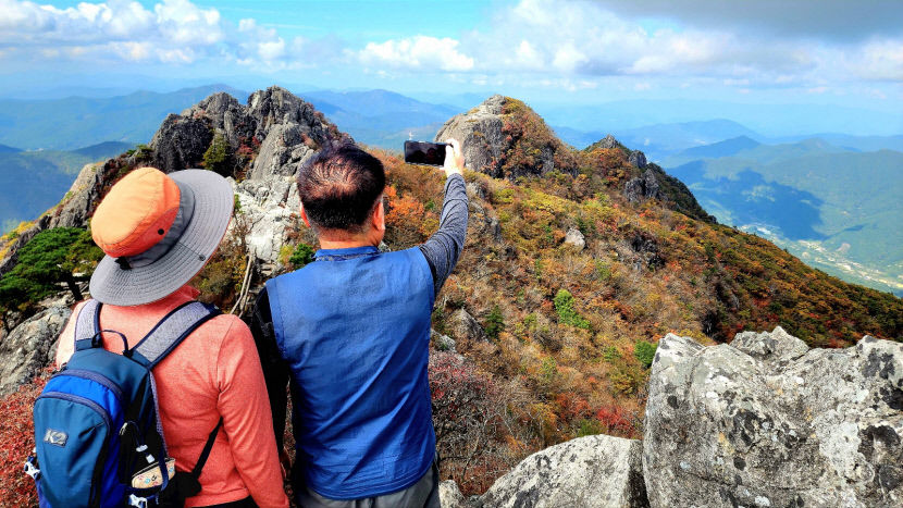 | 울긋불긋 단풍이 깃든 가야산을 찾은 부부가 가야산 정상에서 기념사진을 촬영하고 있다. <성주읍 이길영씨 제공> |
