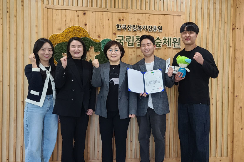수상자는 한국산림복지진흥원 소속 국립칠곡숲체원 현장실습에 참여한 경험을 살려 '별을 만나다, 거꾸로 멘토링' 아이디어를 제안한 이재빈(오른쪽 둘째), 김지훈(오른쪽 첫째) 학생이다.