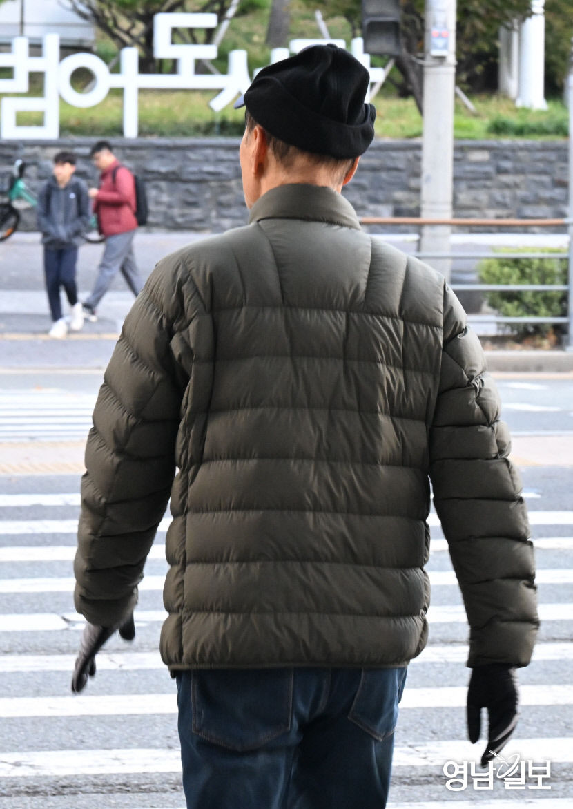 입동을 하루 앞두고 쌀쌀한 날씨를 보인 7일 오전 겨울 외투를 입은 한 시민이 대구 수성구청 앞 횡단보도를 건너고 있다, 이날 대구 오전 최저기온은 7.6℃로 6일 19.8℃ 대비 약 12℃ 가량 떨어졌다.