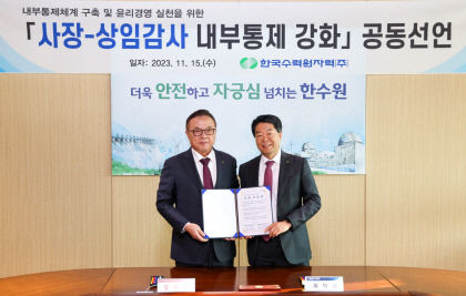 한국수력원자력 황주호 사장과 최익규 상임감사위원은 내부 통제 체계 강화에 대한 강력한 의지를 대내외에 표명하기 위해 15일 경주 본사에서 내부 통제 강화 공동 선언식을 열었다.