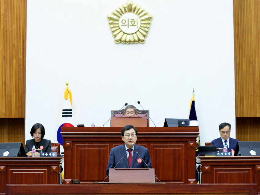 | 29일 경주시의회 본회의장에서 주낙영 경북 경주시장이 시정 연설을 하며 2024년 시정 방향을 밝히고 있다. <경주시 제공> |