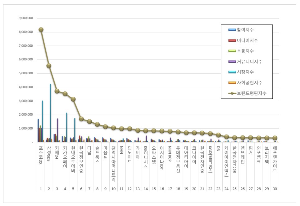 5위, 현대오토에버 브랜드는 참여지수 340,060 미디어지수 262,860 소통지수 282,666 커뮤니티지수 350,911 시장지수 1,743,898 사회공헌지수 142,879가 되면서 브랜드평판지수 3,123,272로 분석됐다. 지난 11월 브랜드평판지수 2,443,851과 비교해보면 27.80% 상승했다.