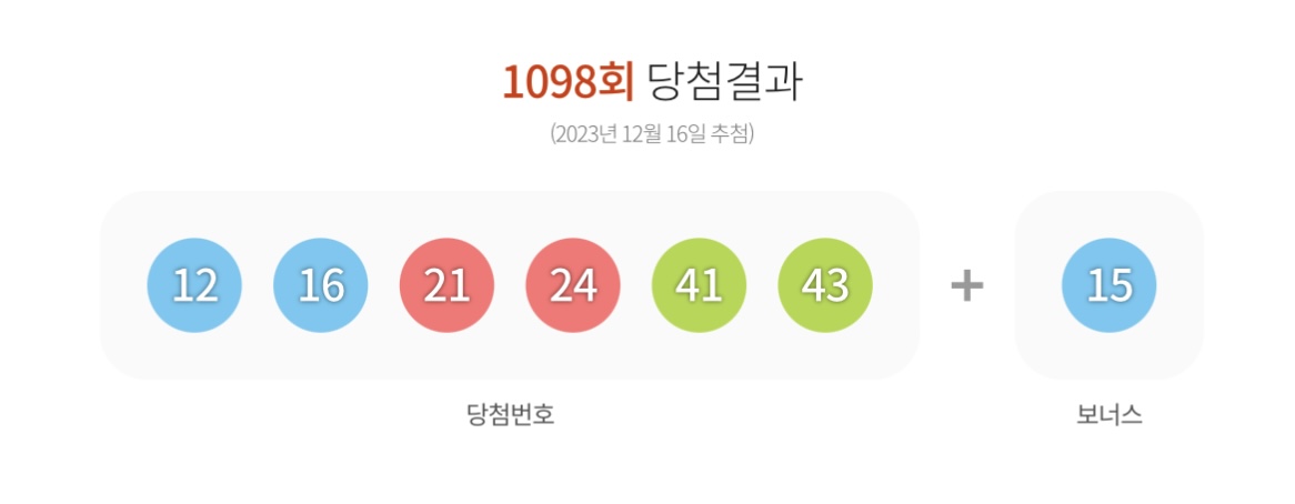 제1098회 로또복권 추첨에서 '12, 16, 21, 24, 41, 43'이 1등 당첨번호로 뽑혔다. 2등 보너스 번호는 '15'다.