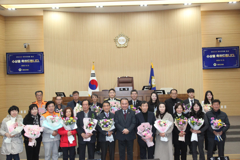 | 지난 21일 예천군의회는 본회의장에서 올해 지역발전과 군민을 위해 봉사하고 의정 발전에 이바지한 유공 군민과 공무원에 대한 시상식을 가진 뒤 기념촬영 하고 있다. <예천군의회 제공> |