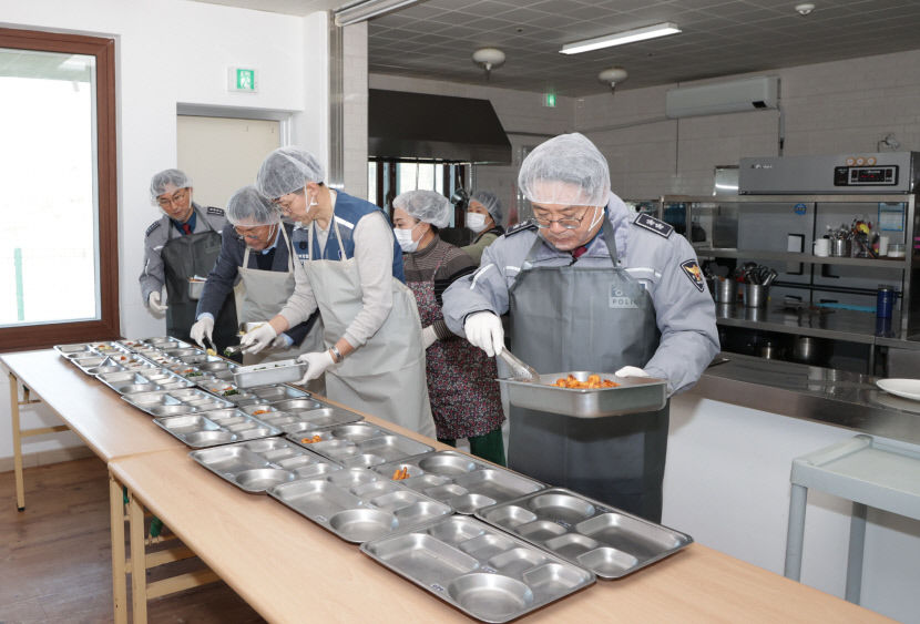 | 최주원 경북경찰청 청장이 29일 경북 예천의 한 요양원에서 배식 봉사 활동을 하고 있다. <경북경찰청 제공> |