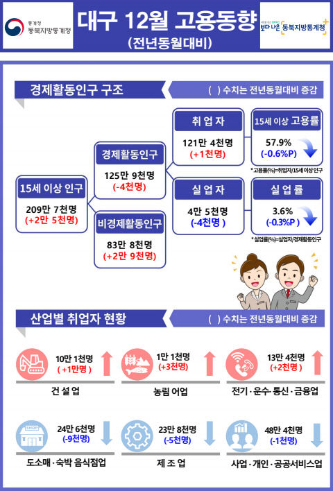 10일 동북지방통계청에 따르면 지난달 대구의 취업자 수는 121만 4천명으로 1년전보다 1천명이 증가했다. 산업별로 보면 건설업(1만 명), 농림어업(3천 명), 전기·운수·통신·금융업(2천 명)에서 늘었다. 반면 도소매·숙박음식점업(-9천 명), 제조업(-5천 명), 사업·개인·공공서비스업(-1천 명)에선 감소했다.