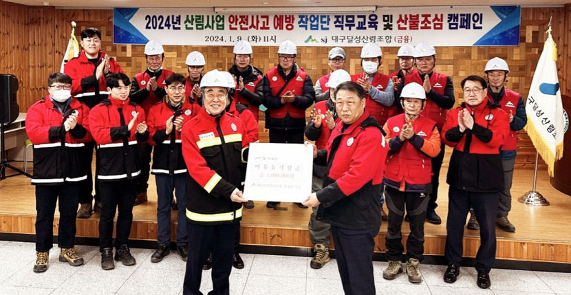 대구달성산림조합(조합장 이석원)이 지난 9일 달성군에 이웃돕기 성금 100만원을 기탁했다. 성금은 이날 '2024년 대구달성산림조합 산림사업 안전사고 예방 직무교육 및 안전기원제'에 참석한 조합 임직원 등 30여 명이 십시일반 모았다.