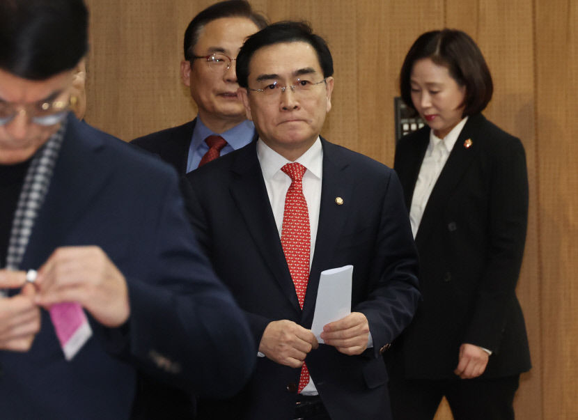 | 국민의힘 태영호 의원이 지난달 29일 국회에서 올해 총선 구로을 출마 선언을 마치고 퇴장하고 있다. 연합뉴스 |