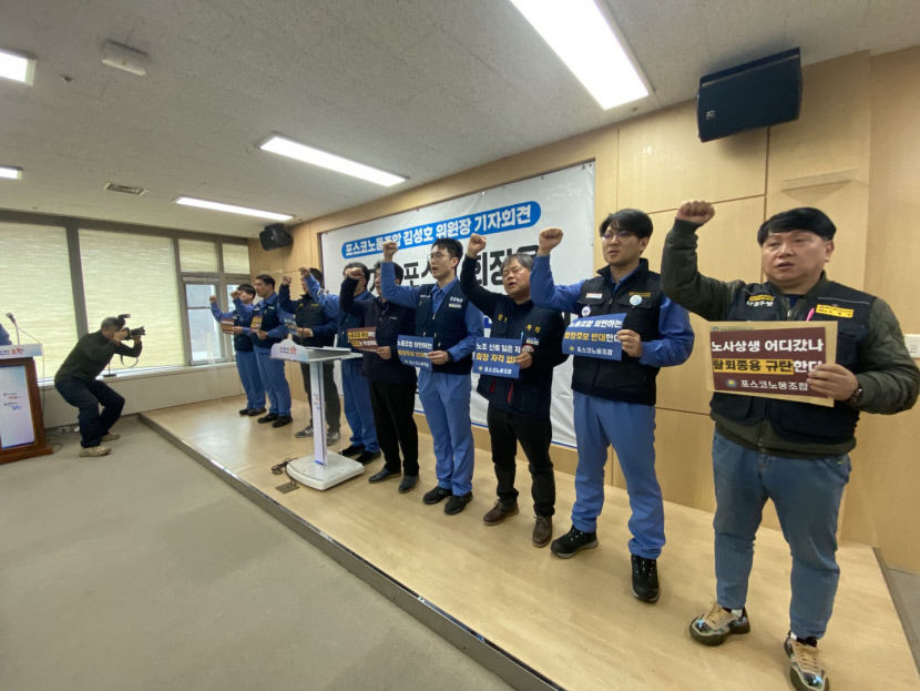 | 포스코 대표 교섭노조인 한국노총 포스코노동조합이 6일 오전 포항시청에서 기자회견을 하고 있다. |