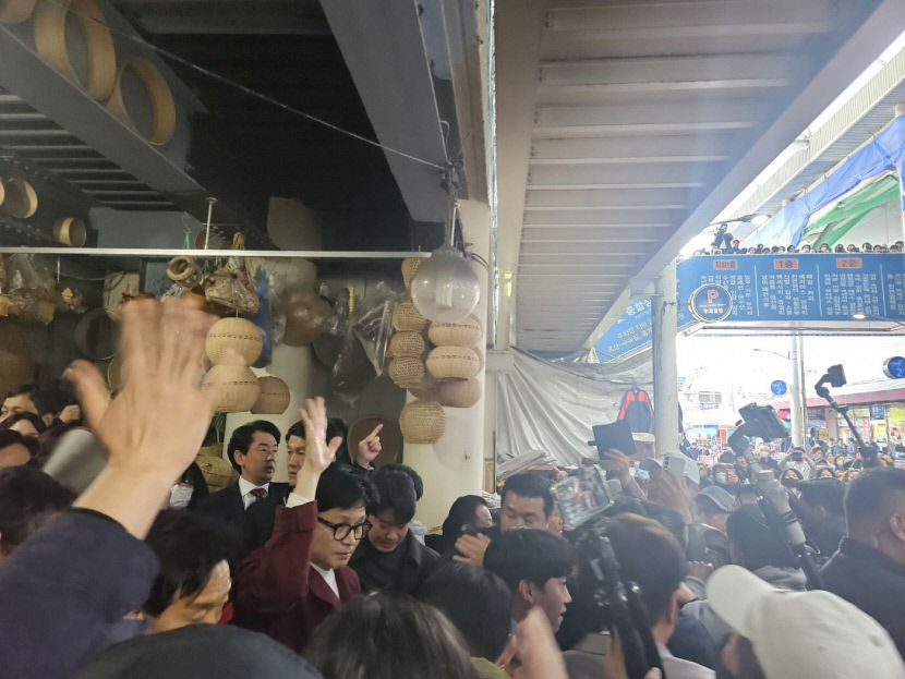 한 위원장은 오후 3시 4분쯤 대구 중구 서문시장 동2문 앞에 도착했다. 인근 육교와 골목, 아케이드 상가 2층 곳곳에 밀집해있던 수천의 인파는 한 위원장을 향해 환호를 보냈다. 한 위원장의 동선에 시민들이 몰리면서 일대는 북새통을 이뤘다. 이 가운데 일부 지지자들은 손을 들어 꽃다발을 내밀었고, '한동훈 사랑해' 등 문구가 쓰인 팻말을 들며 환영했다. 한 위원장이 왼쪽 손목에 붉은색 스카프를 감고 연신 흔들며 호응하자 시민들은 '한동훈'을 연호했다. 한 위원장은 인파를 뚫고 100m가량을 20여 분 이동하면서 시민들과 일일이 손을 잡았다. 상인회 사무실에 들러 인사도 나눴다. 한 위원장이 대구를 '선거 시작점'으로 선포하자 시민들의 환호는 극에 달했다. 그는 시장통 가운데 자리를 잡고 시민들을 향해 "저희가 오늘 대구에서 이번 선거를 시작한다"라며 "이번 선거는 대한민국을 망치는 것을 막겠다는 일념으로 나왔다. 저희 밖에 없다. 저희가 이기겠다"고 했다. 그러면서 "대한민국이 진짜 어려움에 빠졌을 때 대구가 대한민국을 구했다"며 "오늘 저희는 대구에서 출발한다. 저희가 이재명과 통진당의 후예들이 대한민국을 장악하고 주류를 장악해서 대한민국을 망치는 것을 막겠다. 대구가 저희와 함께 해달라"고 목청을 높였다. 서문시장 일정에는 무소속 도태우 후보와 맞설 김기웅 중-남구 예비후보는 물론 대구지역 후보들이 대거 동참했다. 이들은 차례로 단상에 올라 한 위원장과 손을 맞잡고, 유세전을 펼쳤다.