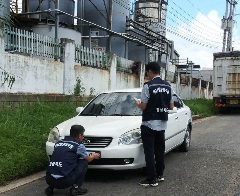 | 영천시 세정과 직원들이 15일 공단지역을 순회하며 자동차 번호판 영치 작업을 하고 있다.<영천시 제공> |