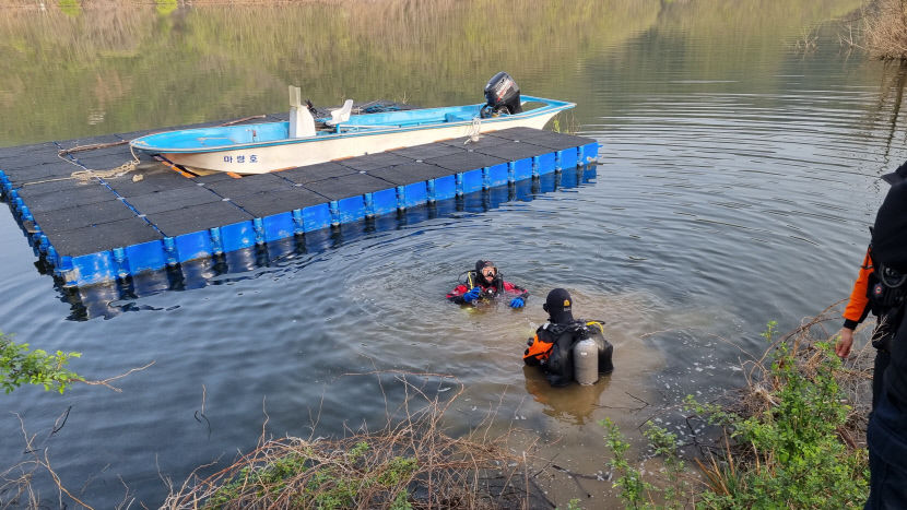 | 17일 오전 7시쯤 경북 안동시 임동면 임하호에서 소방 당국이 잠수부를 투입해, 물에 빠진 1t 화물차를 수색하고 있다.<안동소방서 제공> |