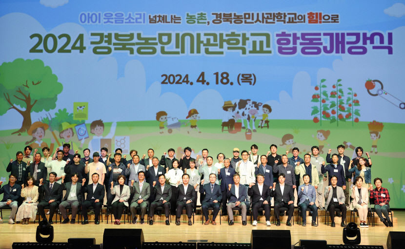 | 18일 영남대 천마아트센터에서 열린 '2024년 경북농민사관학교' 합동 개강식에서 입학생과 내빈들이 기념촬영을 하고 있다. <경북도 제공> |