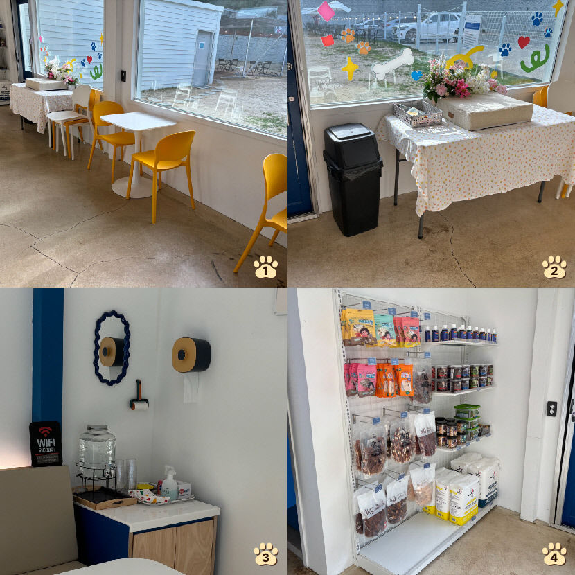 | ①내부 모습 ②포토존 ③서비스 테이블 ④판매중인 간식과 제품들 |