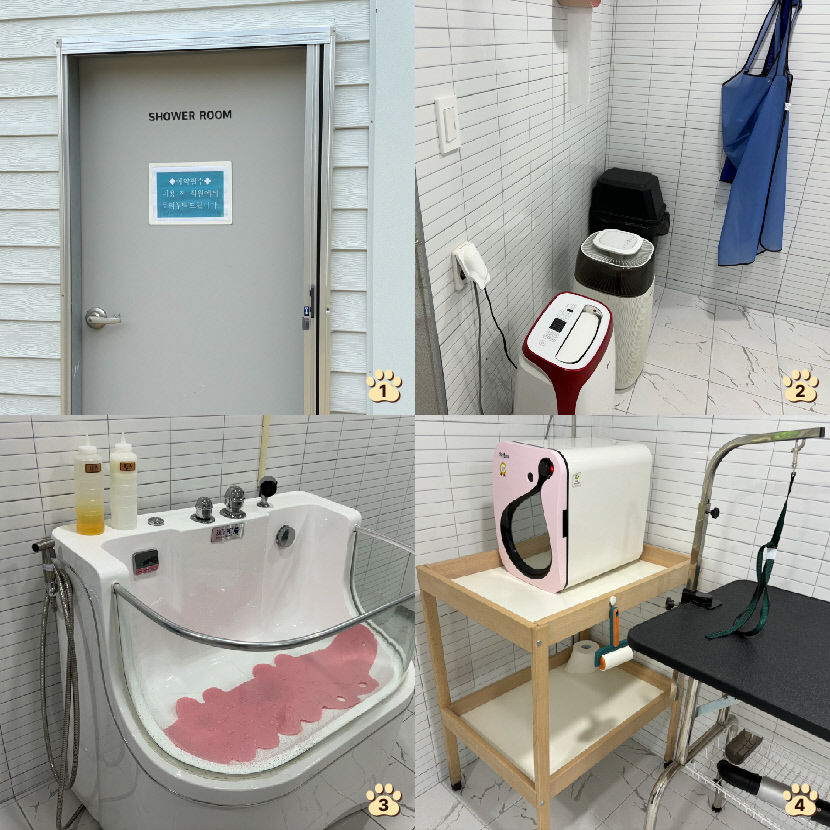 | ①샤워실 바깥 모습 ②샤워실 내부. 공기청정기, 쓰레기통, 앞치마 등이 비치된 모습 ③가정용 욕조보다 깊은 반려견 전용 욕조 ④멸균 소독기와 미용 테이블 |