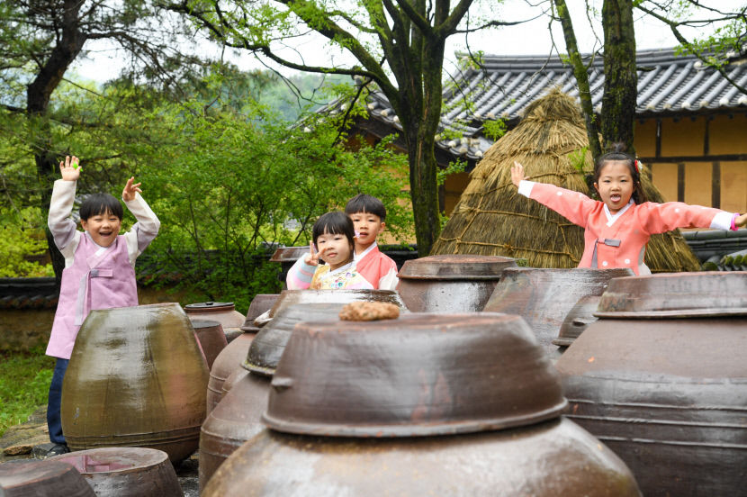 | 선비촌을 찾은 아이들이 장독대에서 숨바꼭질을 하고 있다. <영주시 제공> |