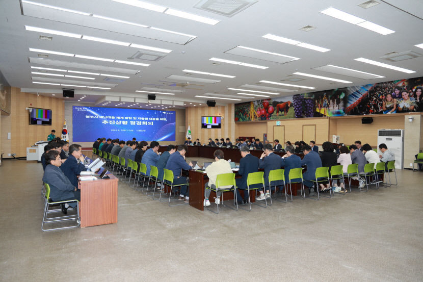 | 지난 7일 영주 시청 대강당에서 '영주시 재난대응 체계 확립 및 저출생 대응을 위한 추진상황 점검회의'가 열리고 있다. <영주시 제공> |