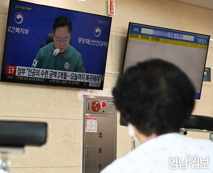 | 의대 정원 증원 반대로 2월부터 이어진 전공의들의 집단행동이 3개월째가 된 20일 대구의 한 대학병원 환자가 관련 뉴스를 시청하고 있다. 보건복지부는 2월19일부터 이탈한 전공의는 전문의 자격 취득을 위해 3개월째인 20일 안으로 복귀할 것을 촉구했다. 박지현기자 lozpjh@yeongnam.com |