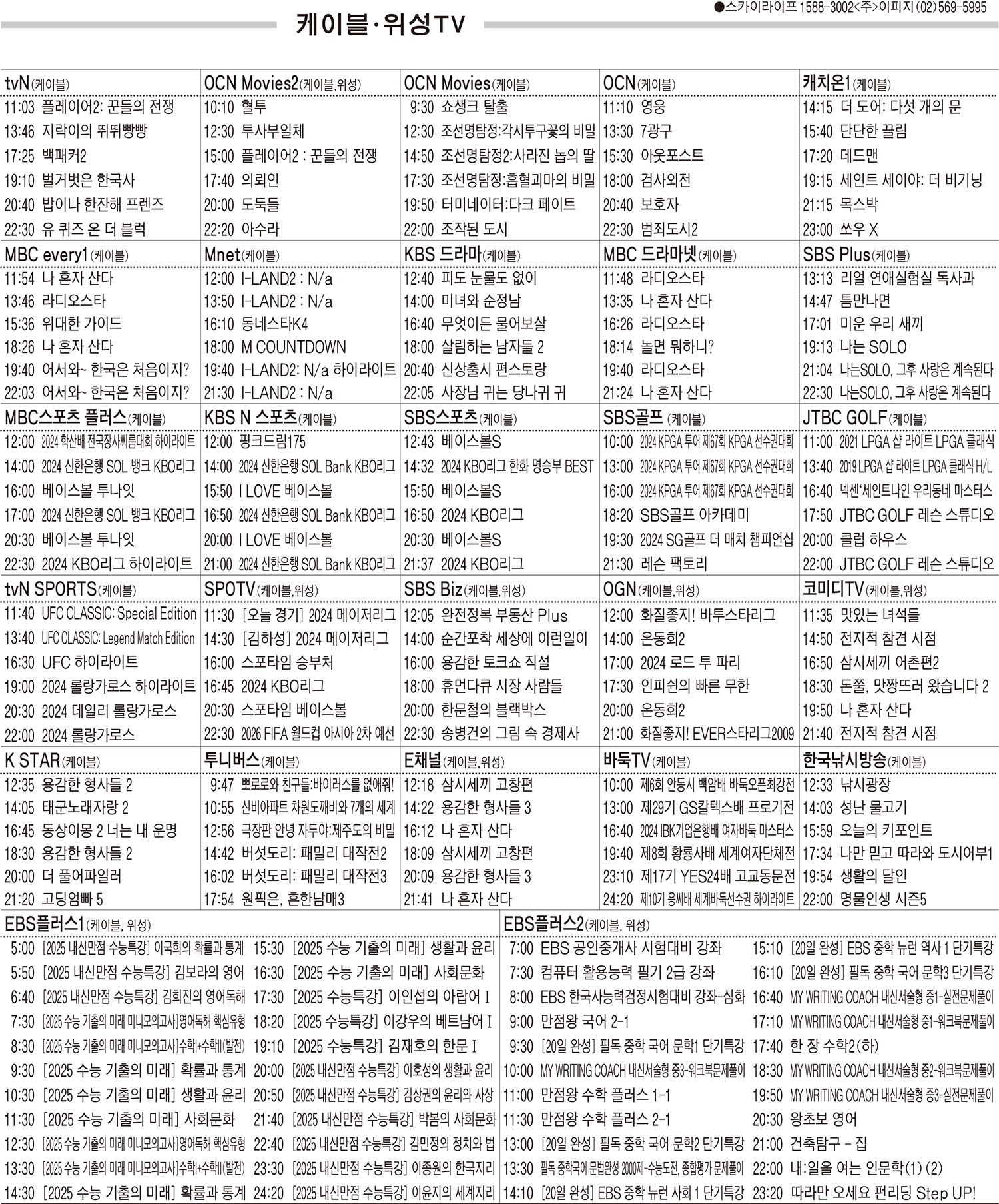 카카오톡 페이스북 트위터 전체 네이버밴드 네이버블로그 6월6일(목) 케이블·위성TV 편성표 박성희 기사 전체보기 영남일보(www.yeongnam.com), 무단전재 및 수집, 재배포금지 연예인기뉴스