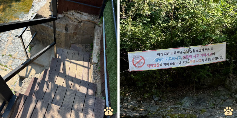 | ①식당과 연결된 계단 ②소화천 안내사항 현수막 |