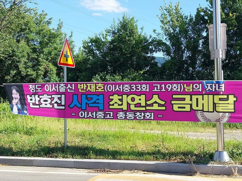 | 청도군 이서면에 '2024 파리올림픽'에서 금메달을 딴 반효진 선수를 축하하는 현수막이 걸려 있다. <독자제공> |