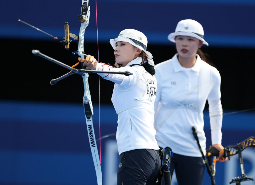 | 프랑스 파리 레쟁발리드에 마련된 양궁 경기장에서 열린 2024 파리올림픽 양궁 여자단체전 네덜란드와의 4강전에서 한국 전훈영이 활시위를 당기고 있다. 연합뉴스 |