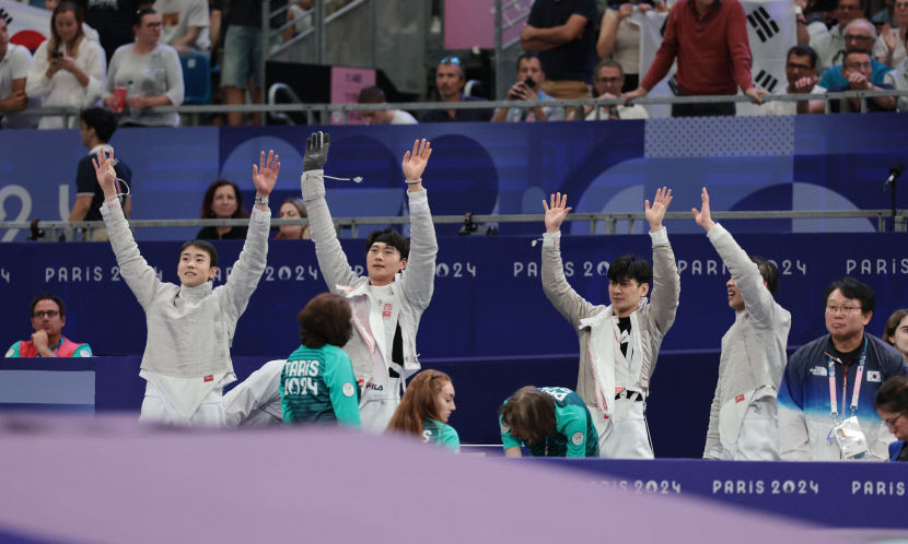 | 31일(현지시간) 프랑스 파리 그랑 팔레에서 열린 2024 파리올림픽 펜싱 남자 사브르 단체 준결승에서 한국 대표팀 선수들이 승리한 뒤 인사하고 있다. 연합뉴스 |