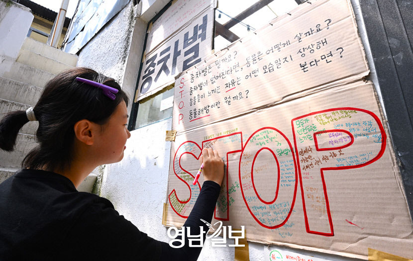 대구동물권행동 '비긴'과 '책빵고스란히'가 공동주최한 '제 3회 대구N맥페스티벌'이 1일 오전 대구 중구 대화의 장에서 열렸다. 이 행사는 기후 위기와 동물권의 대안 마련을 모색하자는 취지로 '종 차별', '동물권', '금호강 르네상스' 등을 주제로 한 다양한 전시 및 체험이 진행됐다.대구N맥페스티벌을 찾은 시민들이 종 차별과 관련된 체험전시에 글을 남기고 있다.