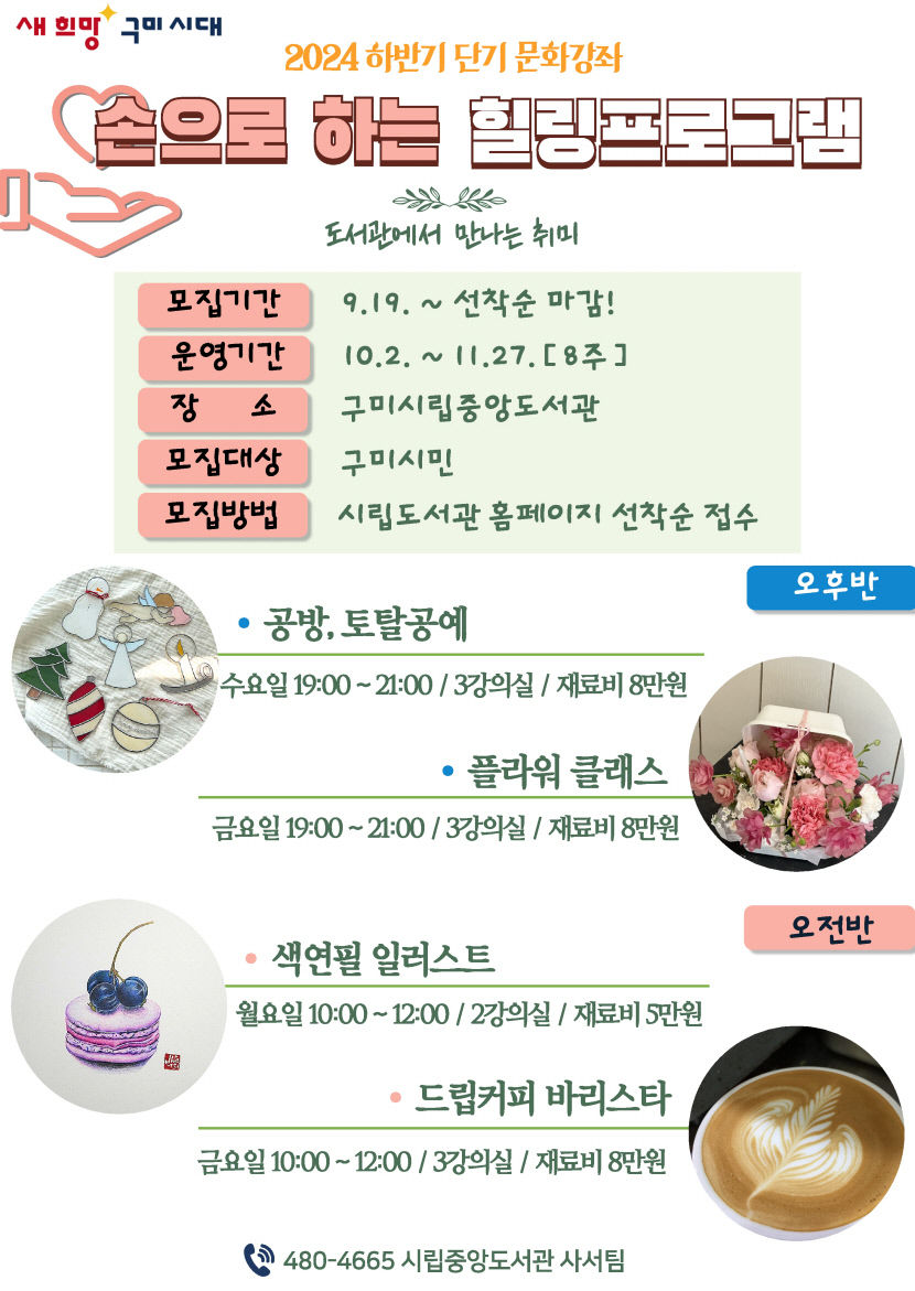 | 구미시립중앙도서관이 운영할 '손으로 하는 힐링프로그램' 수강생 모집 포스터<구미시립중앙도서관 제공> |