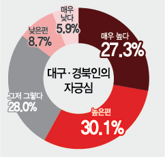 대구에선 55.8%, 경북에선 58.9%가 '자긍심이 높다'고 응답했다. 남성에선 높다가 59.6%로 낮다(15.8%)보다 43.8%포인트 높았다. 여성에선 높다가 55.3%로 낮다(13.5%)보다 41.8% 포인트 높았다. 연령별로는 60대(높다 65.6%, 낮다 5.9%)와 70대 이상 고 연령층(높다 69.3%, 낮다 6.6%)에서 '높다'는 평가가 압도적이었다. 만 18세 이상부터 20대까지 저연령층에서도 '높다'가 '낮다'는 평가 대비 47.1%포인트 높았고, 30대(33.4%포인트), 40대(23.2%포인트), 50대(27.3%포인트)에서도 마찬가지였다.