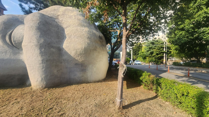 | 대구 달서구의 원시인 조형물인 '이만옹' 머리 부분에 커다란 테이프가 붙여진 모습. 지난 9월 음주운전 차량의 돌진 사고로 심한 파손이 발생했다. 노진실 기자 |