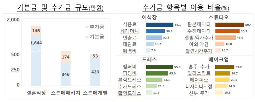 기재부가 올해 5~11월 결혼서비스 업체 2천여 곳에 대해 신혼부부 995쌍 및 9개 온라인 플랫폼을 조사한 결과, 결혼서비스에 대한 평균 지불액은 2천468만원에 달했다. 이중 결혼식장은 평균 기본금이 1천644만원이었고, 스드메(스튜디오·드레스·메이크업) 패키지 기본금은 346만원이었다.