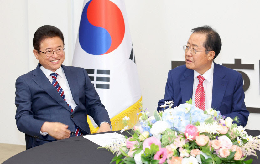 | 이철우(왼쪽) 경북도지사와 홍준표 대구시장이 대화를 나누고 있다. 경북도 제공 |