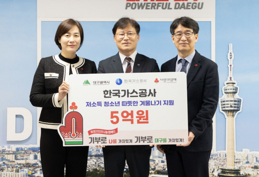 한국가스공사는 지난달 30일 대구지역 저소득가정 청소년의 따뜻한 겨울나기를 지원하기 위해 5억원의 성금을 대구사회복지공동모금회에 기탁했다고 1일 밝혔다.