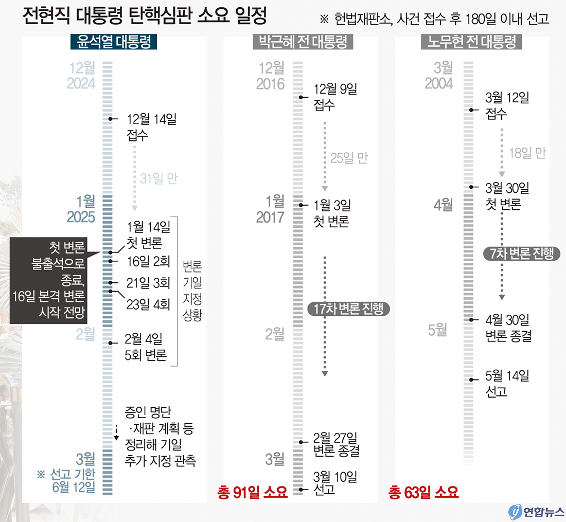 정치권은 헌재가 내달 기일을 추가 지정할 것으로 보고 있다. 최근 탄핵 심판을 두고 국론 분열이 극심한 데다 윤 대통령 측에서 공정한 재판을 강하게 요구하는 만큼 헌재가 변론 횟수를 충분히 보장할 것이라는 이유에서다. 법조계에서는 헌재가 박 전 대통령 사건과 유사하게 2월 말∼3월 초쯤 변론을 종결하고 3월 중순∼말쯤 심판을 선고할 것이라는 전망이 나온다. 다만 윤 대통령 쪽에서 180일의 탄핵 심판 기간을 보장해달라고 요구하고 있고, 여권에서도 '속도조절론'을 주장하는 점은 변수로 꼽힌다.