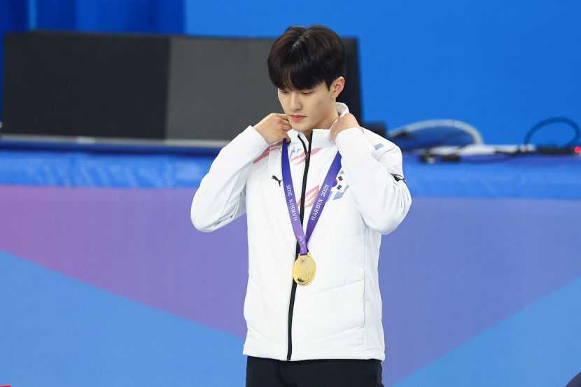 | 9일 중국 하얼빈 헤이룽장 빙상훈련센터 다목적홀에서 열린 하얼빈 동계아시안게임 쇼트트랙 남자 1,000m 시상식에서 장성우가 시상대에 올라 금메달을 목에 걸고 있다. 연합뉴스 |