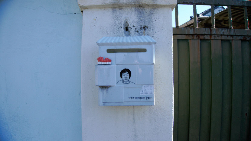 | 젊은 시절 성냥공장에서 일했던 집 주인의 얼굴이 하얀 우편함에 그려져 있다. 주름지고 웃음 띤 얼굴 곁에는 그들의 추억과 소망이 적혀 있다. |