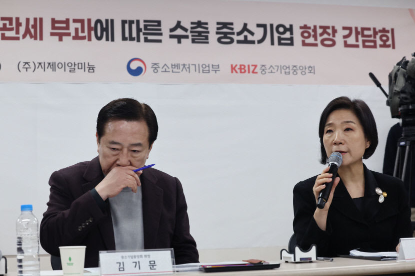 | 오영주(오른쪽) 중소벤처기업부 장관이 12일 경기도 화성시 알루미늄 제품 제조업체인 지제이알미늄에서 열린 미국의 철강·알루미늄 관세 부과에 따른 수출 중소기업 현장 간담회에서 발언하고 있다. 왼쪽은 김기문 중소기업중앙회 회장. 연합뉴스 |
