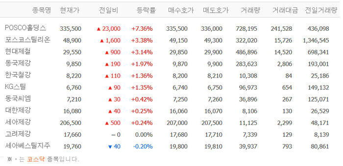 같은시각 네이버 pay 증권에 따르면 이날 주요철강종목은 포스코스틸리온 3.38%, 현대제철 3.14%, 동국제강 1.97%, 한국철강 1.36%, 동국씨엠 0.42%, 대한제강 0.25%, 세아제강 0.24% 등 강세를 나타내고 있다. 반면 세아베스틸지주는 -0.20%로 소폭 하락세다.
