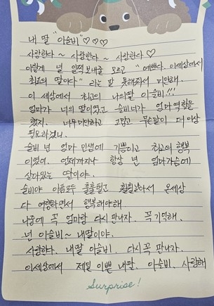 “내 딸 슬비야, 넌 엄마 인생의 기쁨이고 최고의 행복이었어. 슬비야, 아픔 모두 훌훌 털고 훨훨 날아 온 세상 다 여행하며 행복해야 해. 나중에 꼭 엄마랑 다시 만나자. 사랑해."