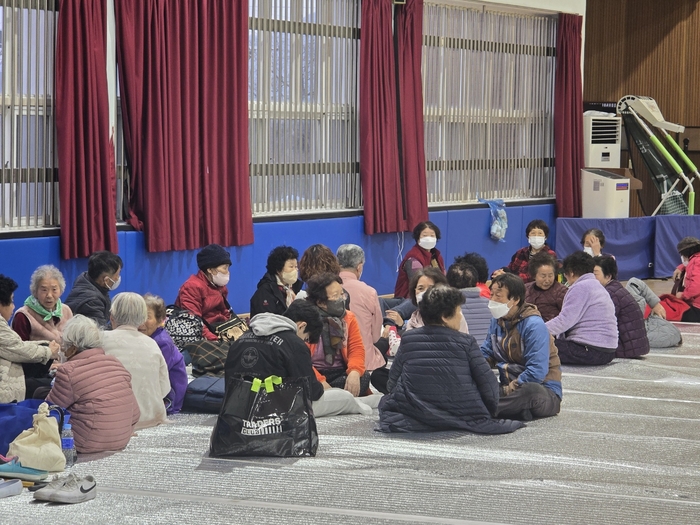 24일 경북 안동시 길안면 주민들이 의성 산불이 지역으로 확산하자 길안중학교 체육관으로 대피했다.