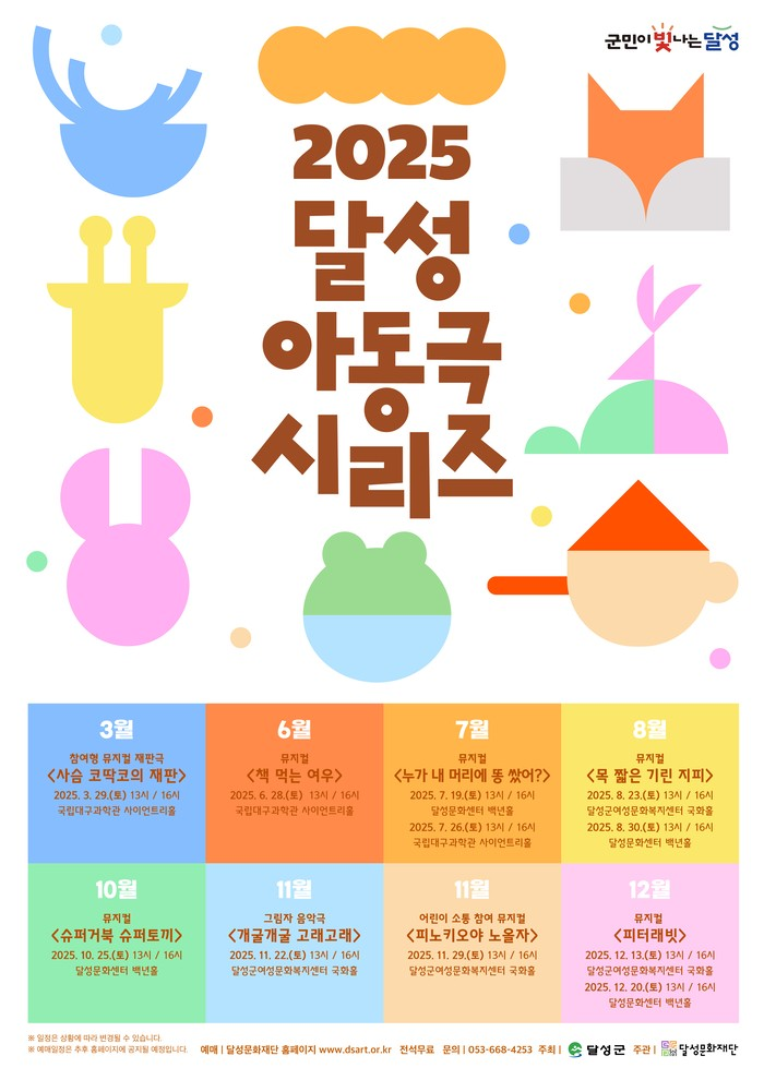 달성문화재단이 '2025 달성 아동극 시리즈'를 12월까지 소극장 3개소(달성문화센터 백년홀, 달성군여성문화복지센터 국화홀, 국립대구과학관 사이언트리홀)에서 진행한다.