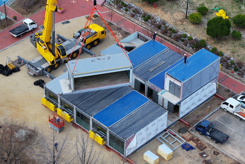 31일 경북 안동시 일직면 권정생어린이문학관 앞에 산불 이재민 긴급주거시설로 모듈러주택이 설치되고 있다. 경북도와 산불 피해 5개 시·군 등에 따르면 1천688동(예산 642억원)의 모듈러주택이 필요한 것으로 파악됐다. 연합뉴스