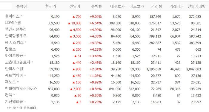 이어 엠앤씨솔루션 4.90%, 한국항공우주 4.35%, RF시스템즈 4.33%, 탈로스 4.23%, 하이즈항공 3.46%, 코츠테크놀로지 2.48%, 한화시스템 2.34%, 쎄트렉아이 1.03%, 제노코 0.92%, 한화에어로스페이스 0.84%, 컨텍 0.30%, 기산텔레콤 0.23% 등도 상승세를 나타내고 있다.