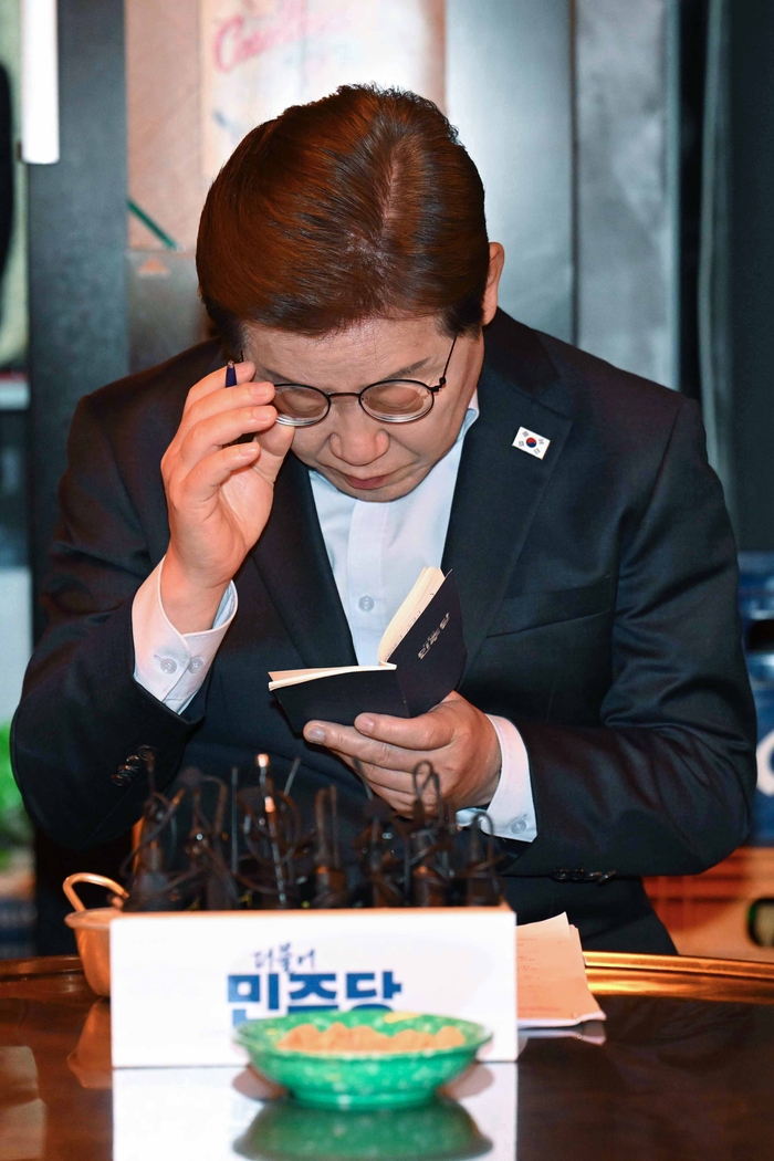 더불어민주당 이재명 대선 후보가 1일 서울 종로구의 한 포차 식당에서 '당신의 하루를 만드는, 보이지 않는 영웅들'이란 주제로 배달 라이더, 택배 기사 등 비(非)전형 노동자들과 간담회를 하던 중 수첩을 들여다보고 있다. 연합뉴스