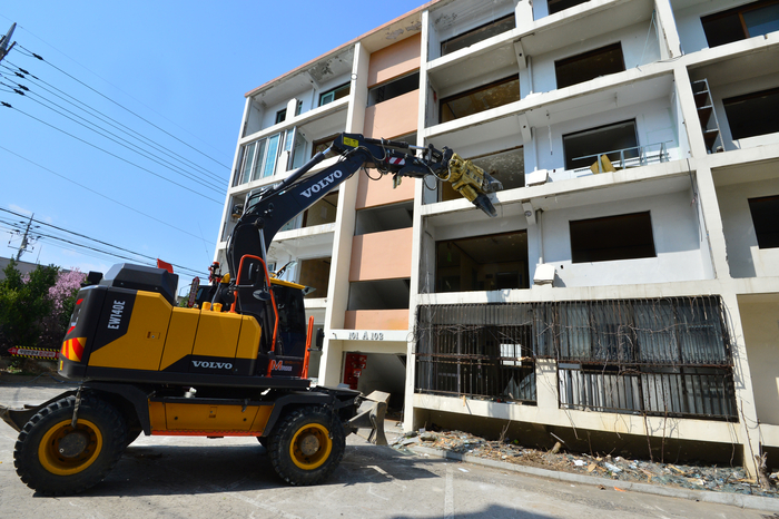 2017년 경북 포항지진으로 부서져 사용 불가 판정이 난 포항 대성아파트가 지난 2020년 3월 철거되고 있다. 김기태기자